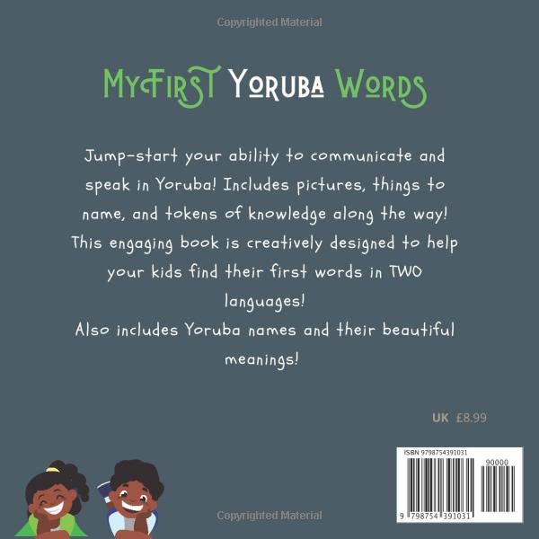 Jump-start your ability to communicate and speak in Yoruba! Includes pictures, things to name, and tokens of knowledge along the way! This engaging book is creatively designed to help your kids find their first words in TWO languages!
