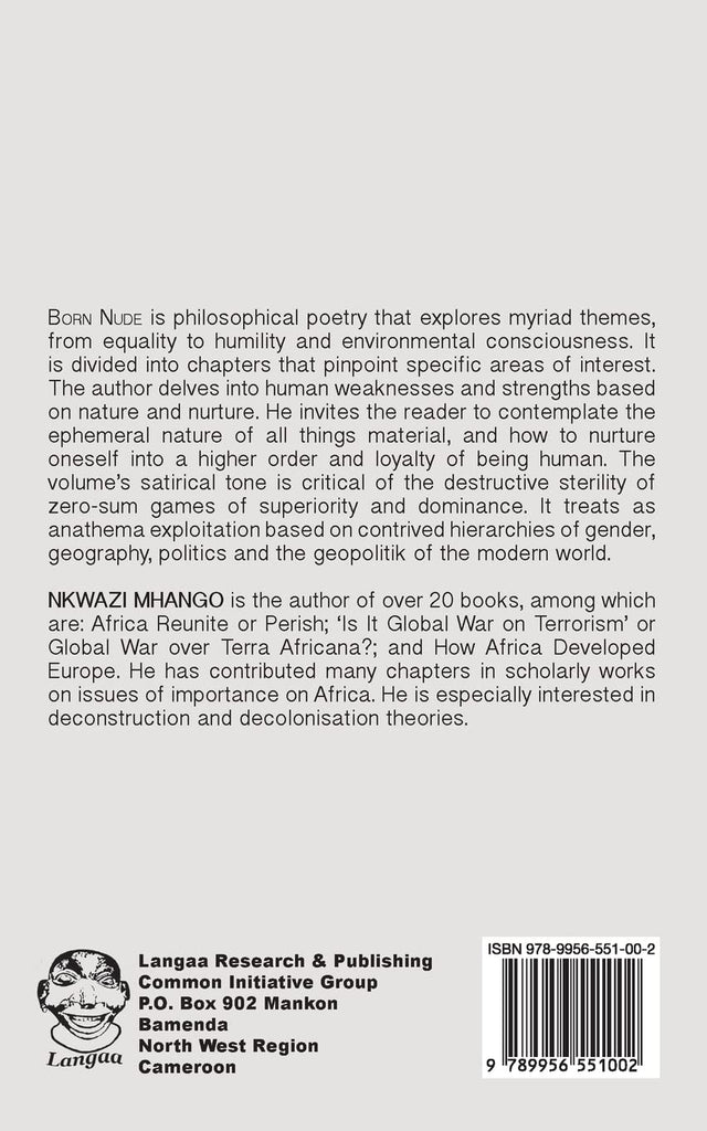 Born Nude is philosophical poetry that explores myriad themes, from equality to humility and environmental consciousness. It is divided into chapters that pinpoint specific areas of interest. The author delves into human weaknesses and strengths based on nature and nurture. He invites the reader to contemplate the ephemeral nature of all things material, and how to nurture oneself into a higher order and loyalty of being human. The volume's satirical tone is critical of the destructive sterility of zero-sum games of superiority and dominance. It treats as anathema exploitation based on contrived hierarchies of gender, geography, politics and the geopolitik of the modern world.