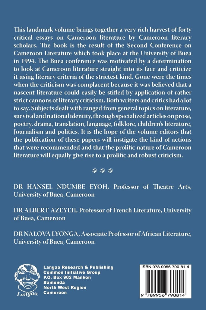 This landmark volume brings together a very rich harvest of forty critical essays on Cameroon literature by Cameroon literary scholars. The book is the result of the Second Conference on Cameroon Literature which took place at the University of Buea in 1994. The Buea conference was motivated by a determination to look at Cameroon literature straight into its face and criticize it using literary criteria of the strictest kind. Gone were the times when the criticism was complacent because it was believed that a nascent literature could easily be stifled by application of rather strict cannons of literary criticism. Both writers and critics had a lot to say. Subjects dealt with ranged from general topics on literature, survival and national identity, through specialized articles on prose, poetry, drama, translation, language, folklore, children's literature, Journalism and politics. It is the hope of the volume editors that the publication of these papers will instigate the kind of actions that were recommended and that the prolific nature of Cameroon literature will equally give rise to a prolific and robust criticism.