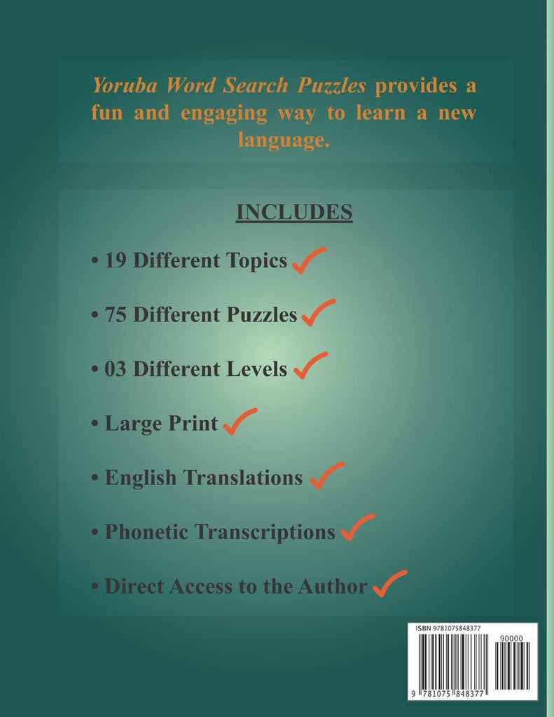 Learn Yoruba from word search puzzles! Yoruba Word Search Puzzles provides a fun and engaging way to learn Yoruba. INCLUDED:• 19 Different Topics ✓• 75 Different Puzzles ✓• 03 Different Levels ✓• Large Print ✓• English Translations ✓ • Phonetic Transcriptions ✓• Direct Access to the Author ✓