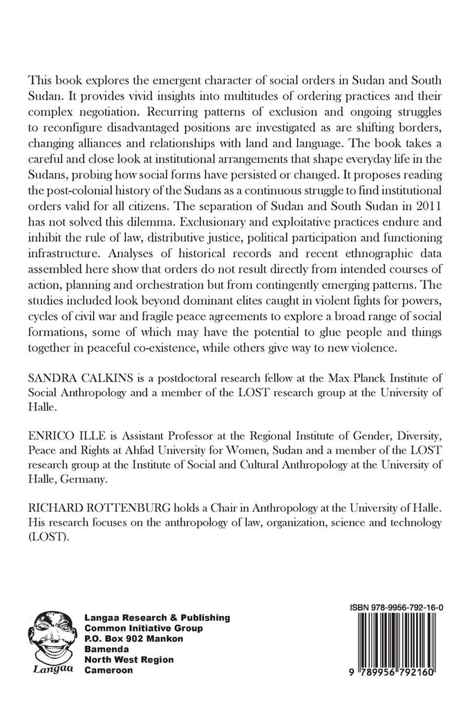 This book explores the emergent character of social orders in Sudan and South Sudan. It provides vivid insights into multitudes of ordering practices and their complex negotiation. Recurring patterns of exclusion and ongoing struggles to reconfigure disadvantaged positions are investigated as are shifting borders, changing alliances and relationships with land and language. The book takes a careful and close look at institutional arrangements that shape everyday life in the Sudans, probing how social forms have persisted or changed. It proposes reading the post-colonial history of the Sudans as a continuous struggle to find institutional orders valid for all citizens. The separation of Sudan and South Sudan in 2011 has not solved this dilemma.