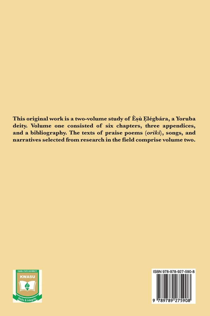 This original work is a two-volume study of Èṣù Ẹlégbára, a Yoruba deity. Volume one consisted of six chapters, three appendices, and a bibliography. The texts of praise poems (orìkí), songs, and narratives selected from research in the fThis original work is a two-volume study of Èṣù Ẹlégbára, a Yoruba deity. Volume one consisted of six chapters, three appendices, and a bibliography. The texts of praise poems (orìkí), songs, and narratives selected from research in the field comprise volume two.ield comprise volume two.