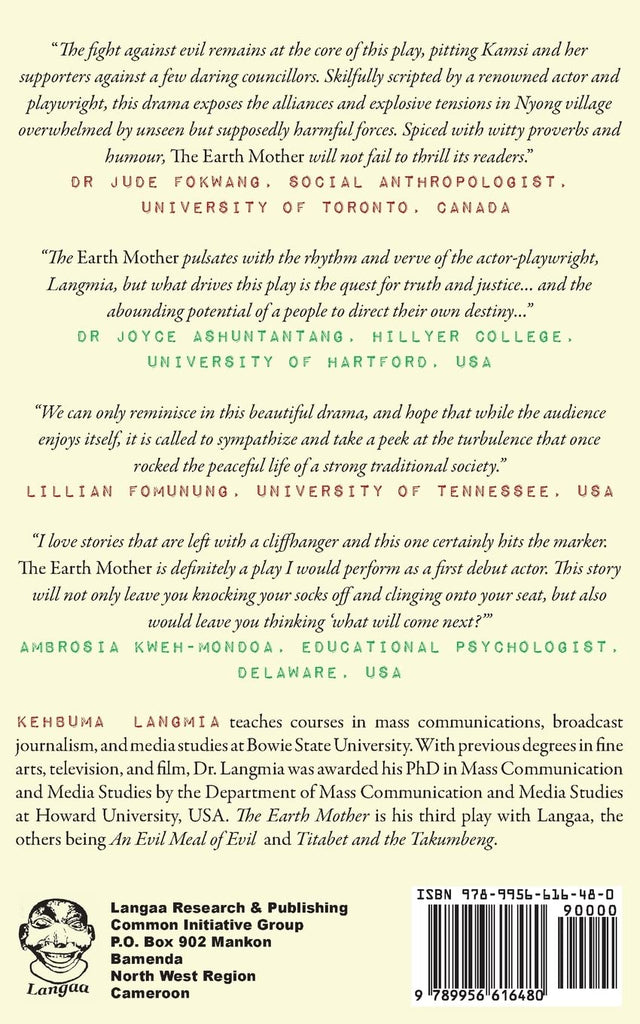 The fight against evil remains at the core of this play, pitting Kamsi and her supporters against a few daring councillors. Skilfully scripted by a renowned actor and playwright, this drama exposes the alliances and explosive tensions in Nyong village overwhelmed by unseen but supposedly harmful forces. Spiced with witty proverbs and humor, The Earth Mother will not fail to thrill its readers.